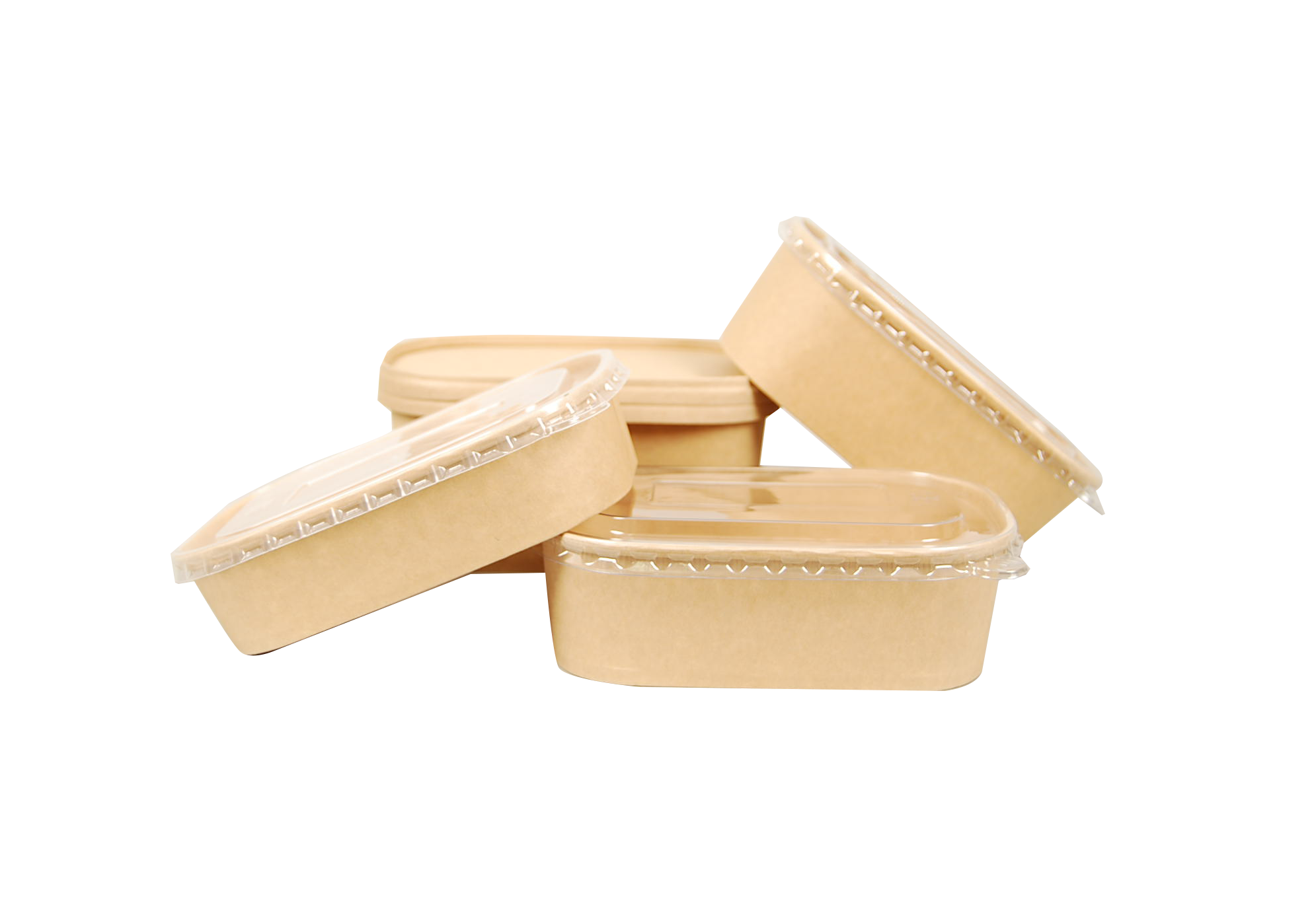 De unieke, met PP beklede kartonnen, rechthoekige bakje is origineel, stijlvol, stapelbaar, ruimtebesparend, vet- en lekvrij, vriezer- en magnetronbestendig, heet afsluitbaar en extreem sterk en duurzaam, waardoor het de ideale verpakkingsoplossing is voor warme of koude afhaal- en bezorgmaaltijden.